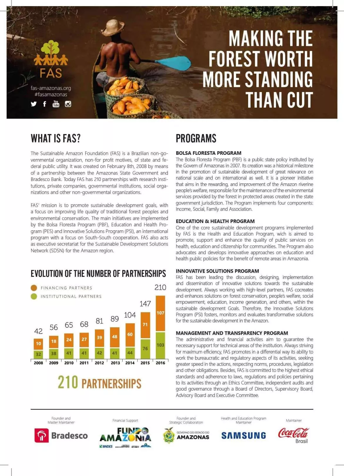 The Sustainable Amazon Foundation (FAS) is a Brazilian non-governmental organization, non-for profit motives, of state and federal public utility. It was created on February 8th, 2008 by means of a partnership between the Amazonas State Government and Bradesco Bank. Today FAS has 210 partnerships with research institutions, private companies, governmental institutions, social organizations and other non-governmental organizations.