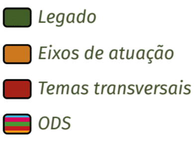 Esses eixos são desenvolvidos considerando ações transversais de empoderamento do público-alvo, inovação, infraestrutura e transparência. Todos os projetos estão conectados aos 17 Objetivos do Desenvolvimento Sustentável (ODS) e aos seus pilares: pessoas, planeta, prosperidade, paz e parcerias.